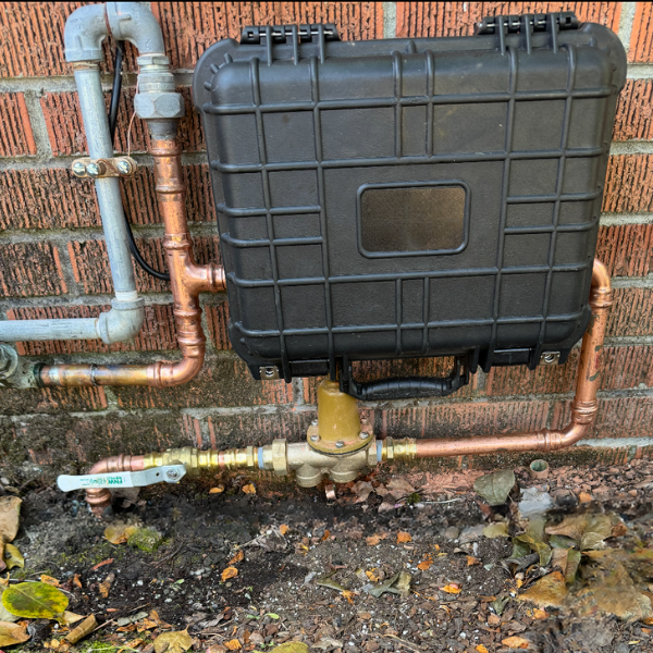 Smart water valve mounted in protective case installed by Phillips Plumbing